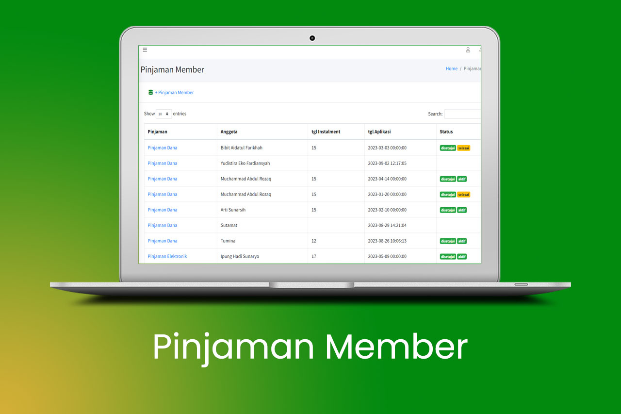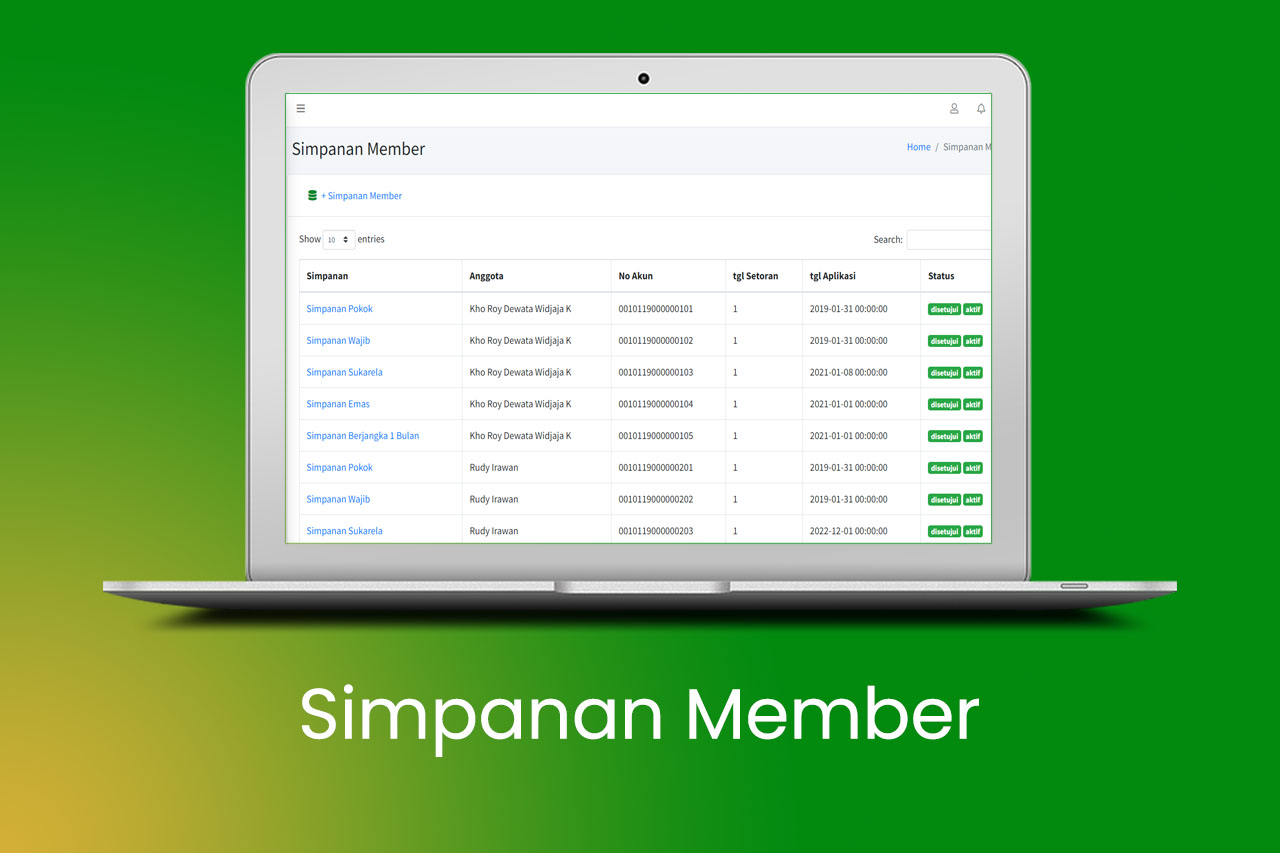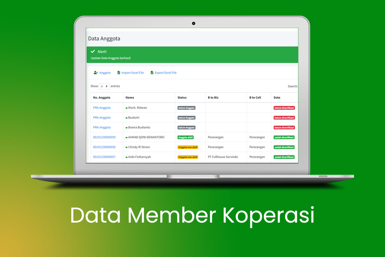 Admin koperasi bisa melihat semua data member koperasi lewat menu data member mulai dari simpanan member, pinjaman member, dan juga kewajiban member. Admin koperasi juga bisa memverifikasi data member baru dan juga melakukan penghentian member koperasi di menu data member.ย
